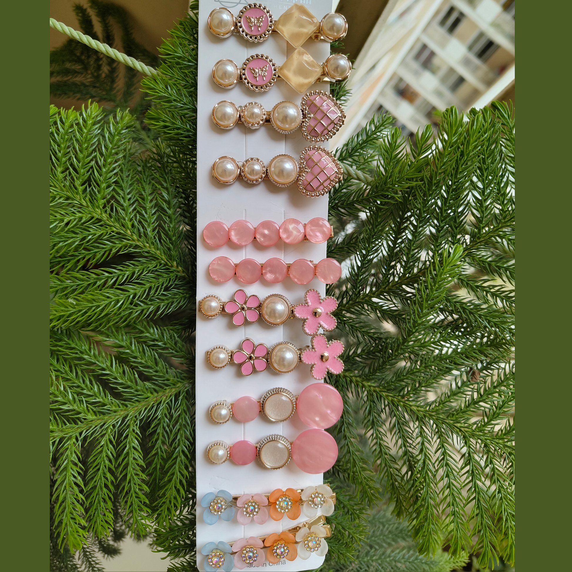 Elevate your hair game with our exquisite 12-piece Yeoja Assorted Hair Clip Set, a must-have collection of stylish and trendy hair accessories for women and girls. Inspired by the latest Korean fashion style, this delightful pack features a perfect blend of lustrous faux pearls, sparkling crystal rhinestones, and sleek metallic designs in classic black and elegant gold tones.