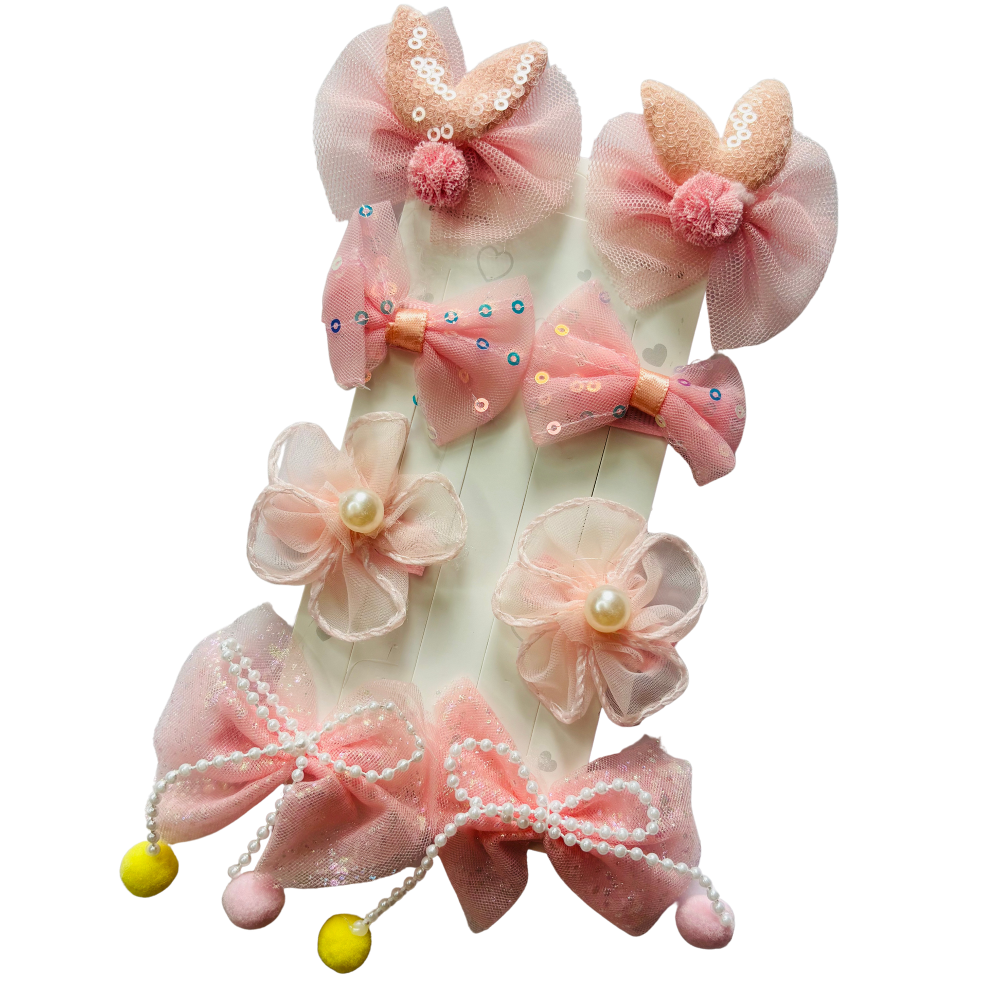 Add a touch of royalty to every hairstyle with the Princess Pearl Bow Set, featuring a delightful mix of sparkling bows, sequined butterfly clips, and charming floral accents. Each piece is designed to stay secure and comfortable, making these clips perfect for birthdays, festive celebrations, or everyday elegance. The delicate tulle, pearls, and playful pompom details create a whimsical look that girls and trendsetters love.